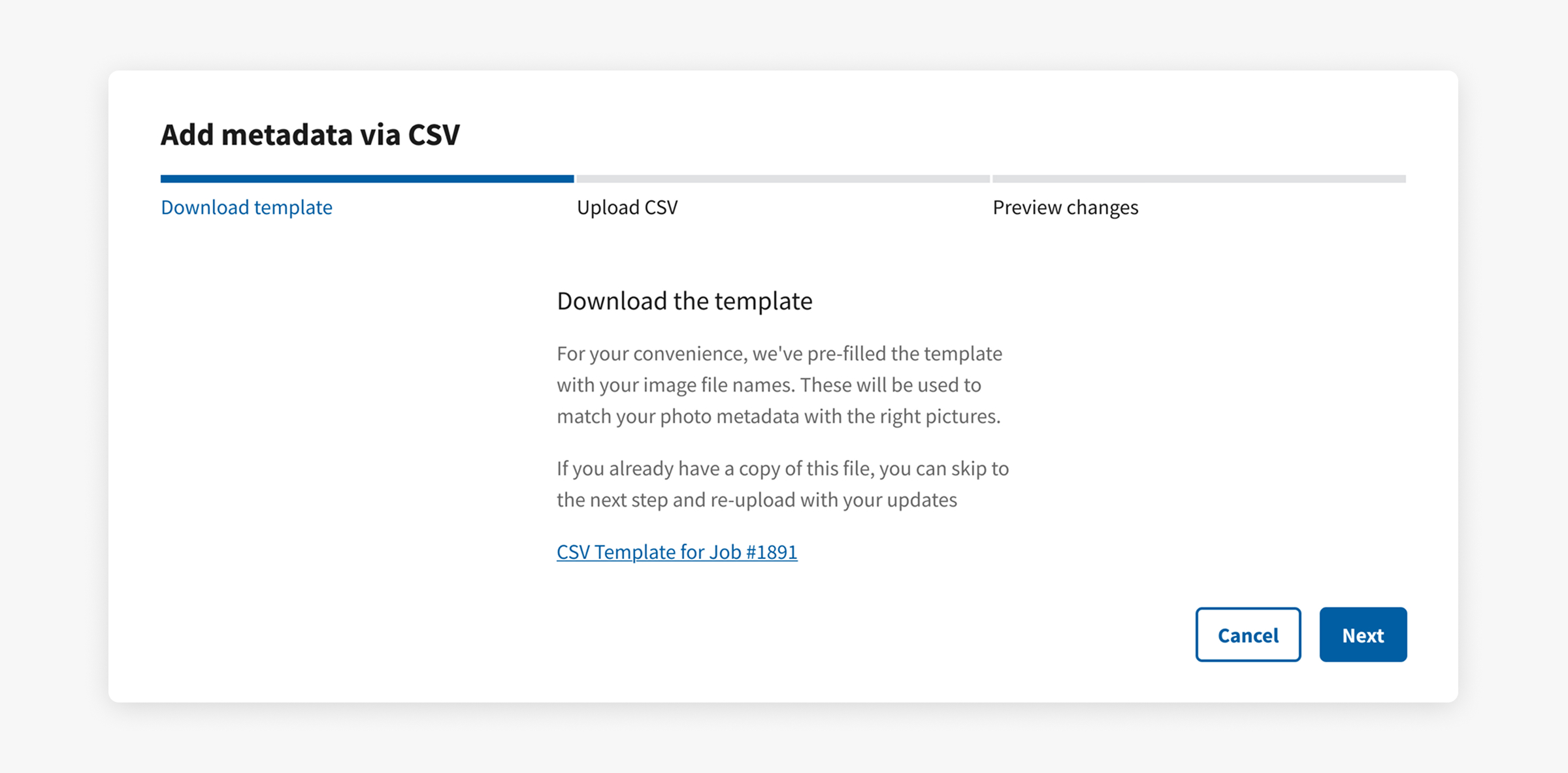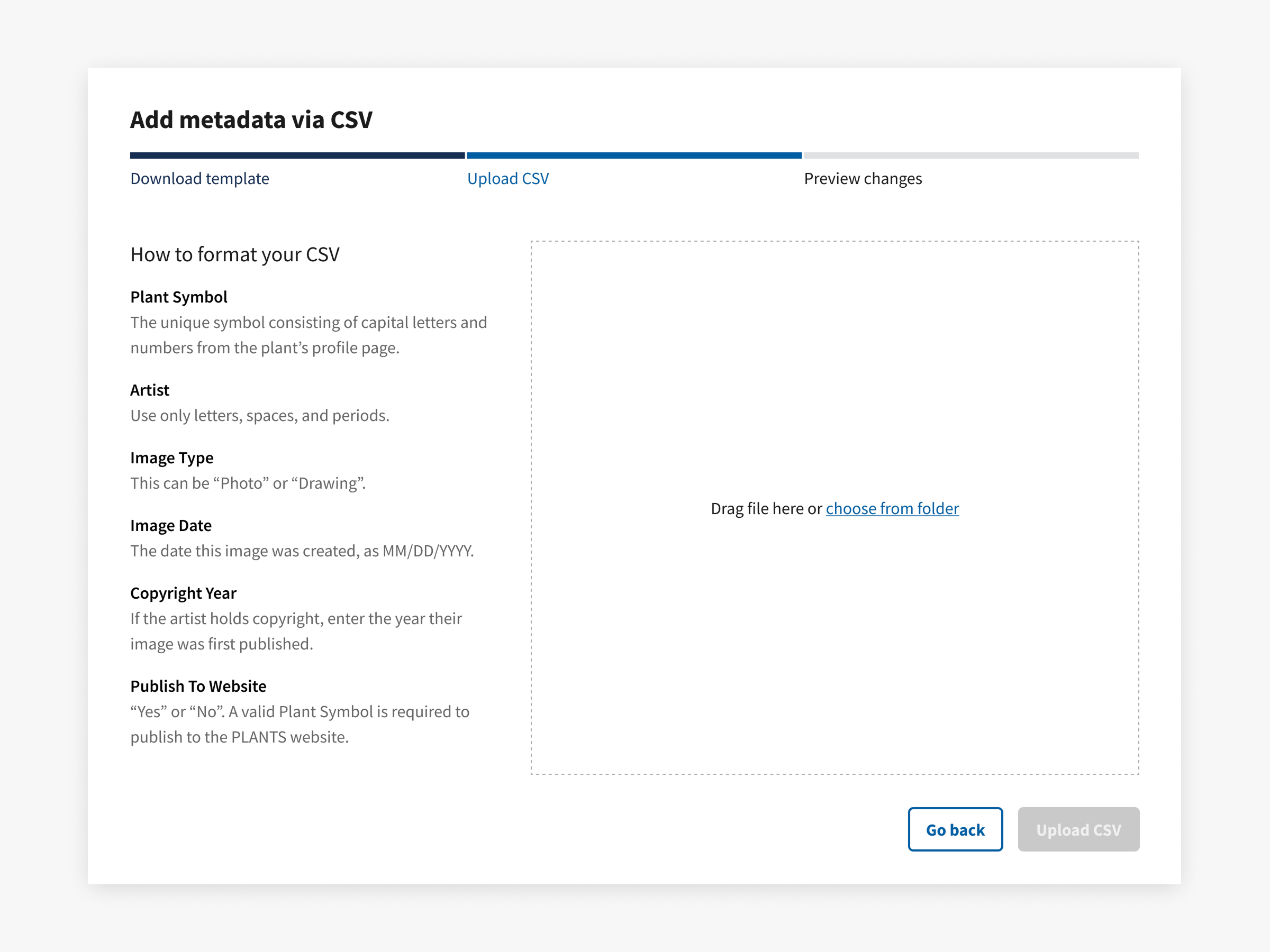 The second step tells users how to format their CSV. Showing them that a "Preview changes" remains lets them know that uploading their CSV won't immediately apply their changes.