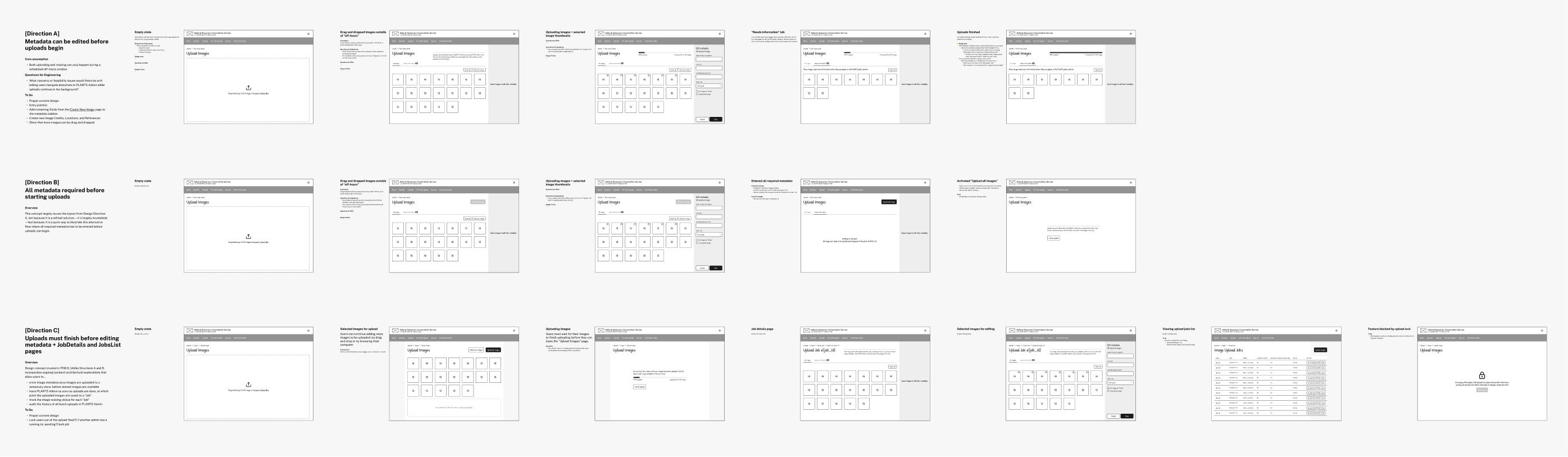 Stakeholders were excited about Direction C but I felt something was off and had trouble figuring out why. With more conversations and reflection I realized that I'd designed one page to do too much—handling both status updates and metadata editing created would create edge cases if admins deleted images or recategorized them after their initial upload.