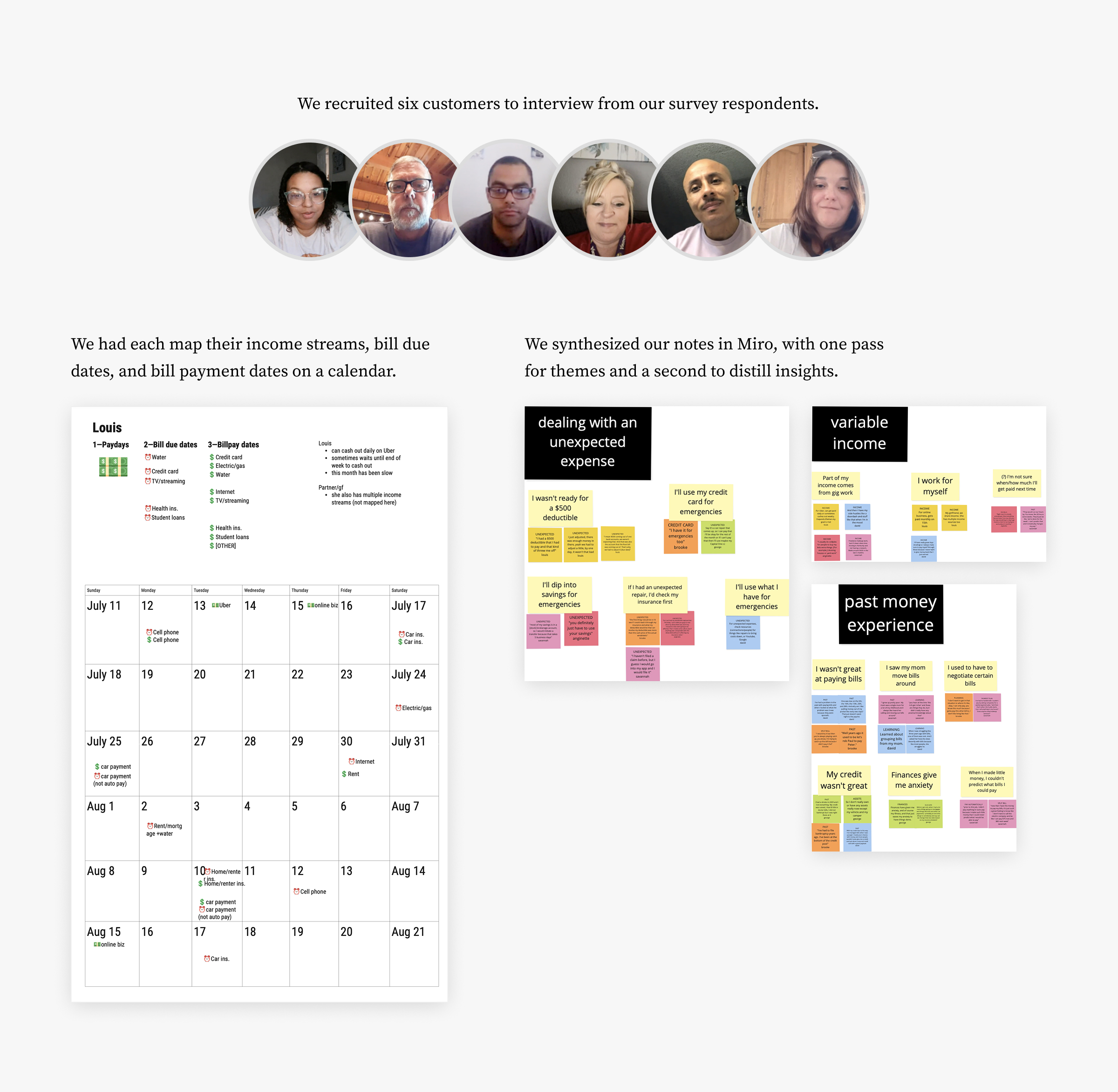 We then interviewed 6 customers, centering each discussion around a calendar activity to learn about their financial situations and how they manage their bills.